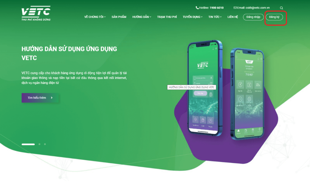 Bước 1: Truy cập vào website chính thức của VETC https://vetc.com.vn/ chọn mục đăng kí ở phía bên phải.