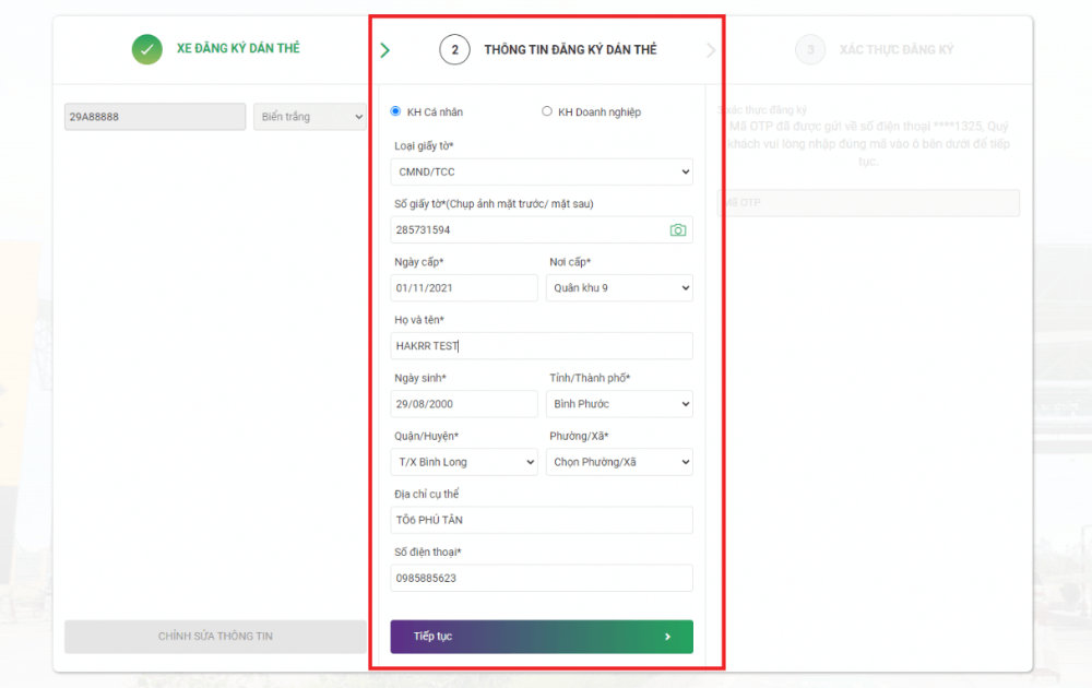 Bước 4: Khách hàng chọn "Cá nhân" hoặc "Doanh nghiệp" và nhập thông tin xe "Đăng ký dán thẻ" theo hướng dẫn, sau đó chọn "Tiếp tục".