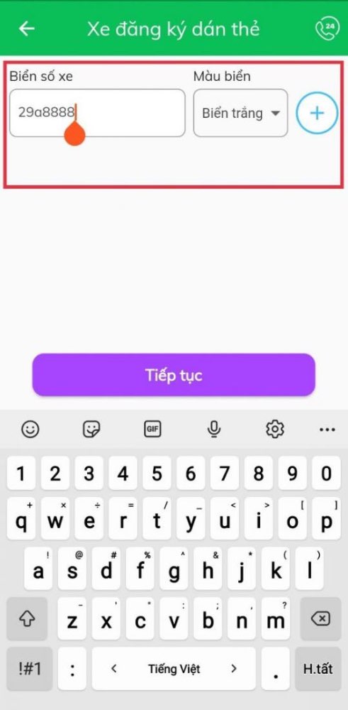 Bước 3: Điền thông tin xe tại mục "Xe đăng ký dán thẻ", sau đó chọn "Tiếp tục".